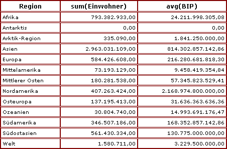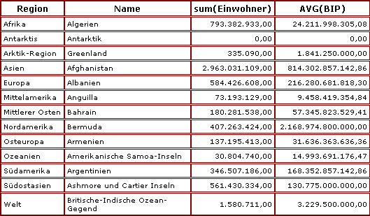 select Region, sum(Einwohner), avg(BIP) from cia group by Region