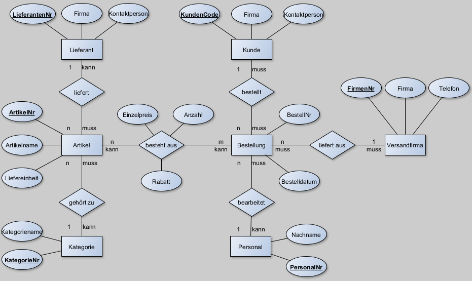 - Lieferant (LieferantenNr, Firma, Kontaktperson, Position, Straße, Ort, Region, PLZ, Land, Telefon, Telefax, Homepage)